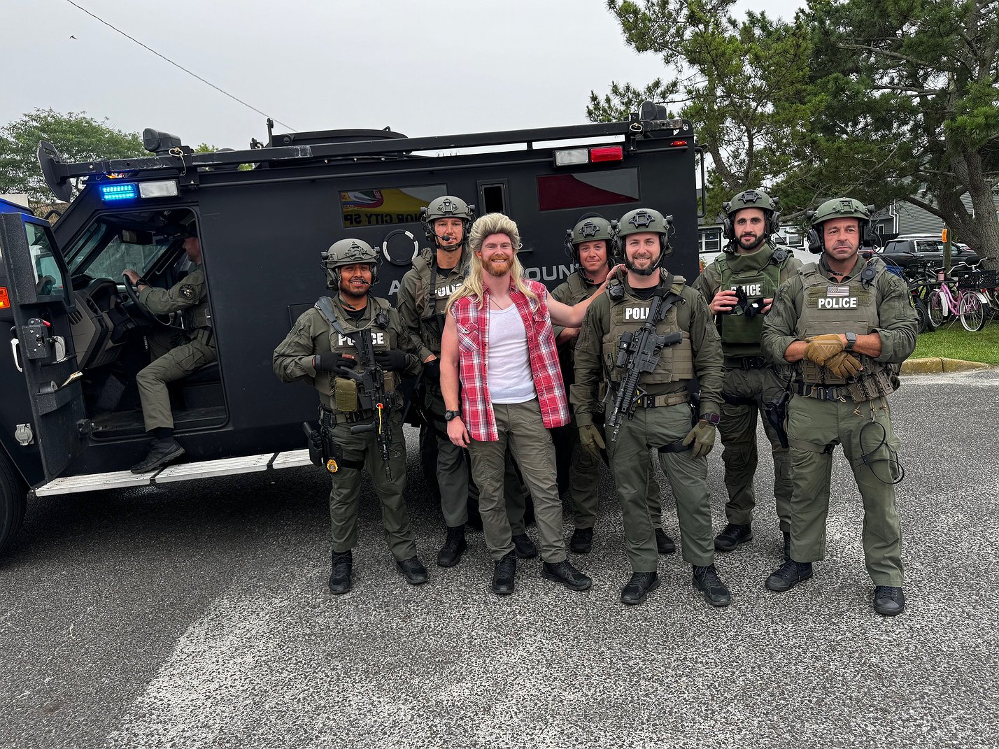 The Atlantic County SWAT Team demonstrated how it would apprehend a suspect who refused to exit her vehicle. The team emerged from an armored vehicle fully protected in riot gear, with one officer setting off a harmless explosive device that attracted the attention of the driver, who was wearing a long blond wig.