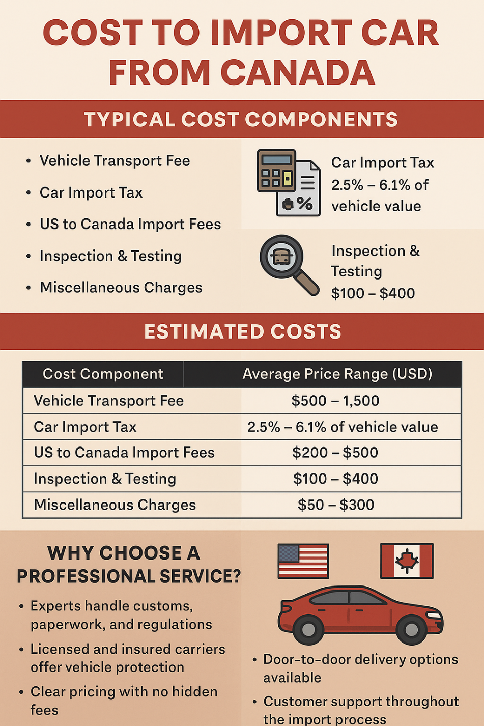 Importing a vehicle across borders requires precise preparation, and one must comprehend the regulations, charges, and protocols implicated. You will pose typical inquiries when contemplating transporting a vehicle between Canada and the U.S. One typical inquiry pertains to what is the cost to import car from Canada or conversely. At DIY Transport, our specialty resides in rendering accessible, dependable, and economical vehicle transport solutions, and this guarantees an uncomplicated import endeavour absent clandestine astonishments.