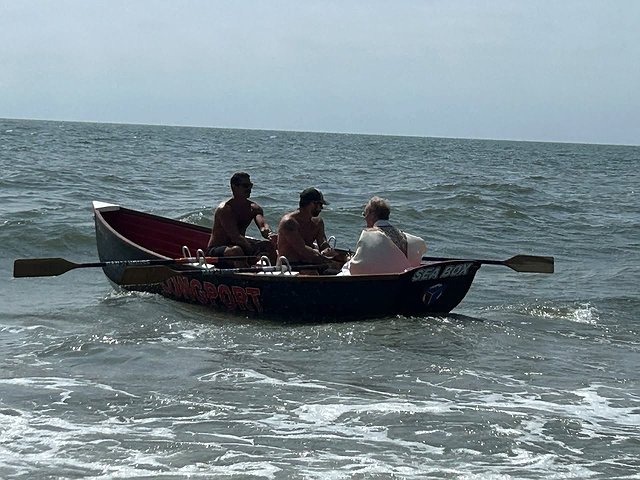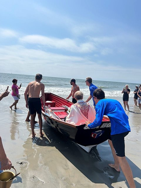 Members of the Longport Beach Patrol rowed pastor of Holy Trinity Parish the Rev. Pawel Kryszkiewicz out past the breaking waves where he tossed a wreath and said a prayer honoring lives lost at sea.