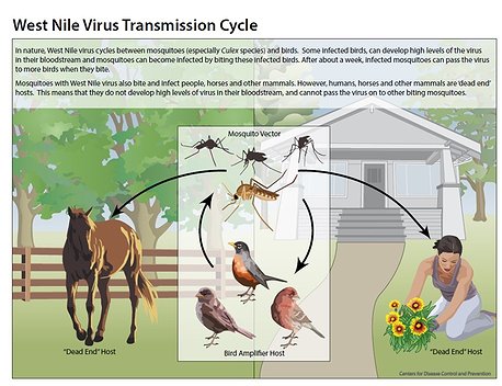 West Nile virus is carried by infected mosquitoes and can be transmitted to birds, animals and humans. Health officials encourage residents to reduce their risk and the spread of West Nile virus by reducing their exposure to mosquito bites by following these tips: