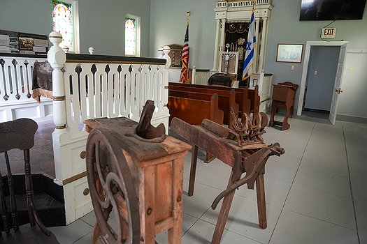 To celebrate the 100th anniversary of the colony in 1982, a small collection of historic photos was placed on the chapel walls. This year’s renovation project included a paint job and a new series of panels combining the photos with historical context. The project also included the installation of a video screen to broadcast oral histories and displays of equipment used by the farmers, including a corn husker and an asparagus buncher.