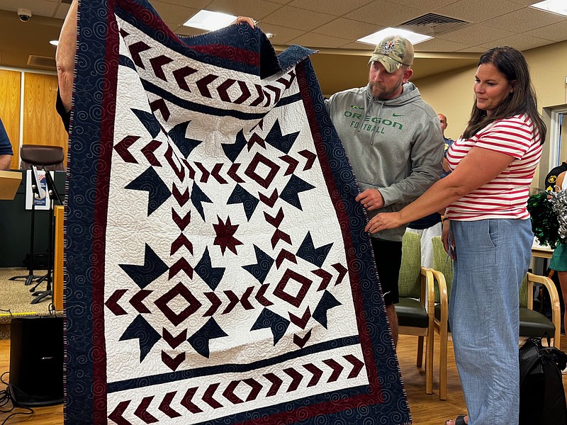 “Although we will never know the extent of your sacrifice to protect and defend the United States of America, we present you with a quilt of valor as an expression of gratitude from a grateful nation,” she said before wrapping Tanton in the red, white and blue quilt.