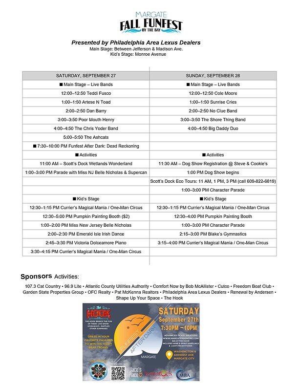 The Margate Business Association’s marquee event, Fall Funfest by the Bay presented by Philadelphia area Lexus Dealers, is back Saturday and Sunday, Sept. 27-28 on Amherst Avenue. The event will be held 11 a.m. to 6 p.m. Saturday, followed by Funfest After Dark: Definitely Not for Kids presented by Tomatoe’s, and 11 a.m. to 5 p.m. Sunday. Also on Sunday, the Dan Gottlieb Memorial Dog Show will be held starting 1 p.m. at Steve & Cookies By The Bay.