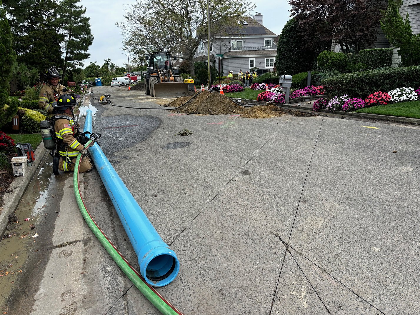 Engine 22 arrived on scene and confirmed that a high pressure gas main was struck and actively leaking. As a precautionary measure a 2.5-inch hose line was stretched, charged and placed near the leak for the protection of fire personnel and crews working in the area.
