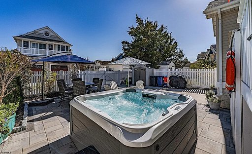 Also located off of the great room are the steps to the large garage and private, enclosed patio. The garage is large enough to store a car or all of your beach chairs and bikes. A large cart is available to transport your stuff to the beach. There is an extra refrigerator/freezer, too. From the garage, you enter the beautifully landscaped patio equipped with a six person sized hot tub, high top fire pit table that also seats six, a low top fire pit table and plenty of seating. There is an enclosed outdoor shower for your use when coming off of the beach as well.