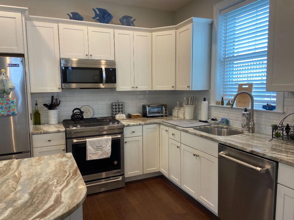 GROUND FLOOR - enter the front door with the keyless entry into the spacious living area. There is a powder room conveniently located as you enter the house. There are couches and chairs providing comfortable seating for ten plus people surrounding the huge smart television located over the gas fireplace. A few steps away is the large dining room table that comfortably seats ten with a high chair and even features a wet bar. Then there's the kitchen - appointed with top of the line appliances, a large pantry, a Keurig (and additional drip coffee maker), plenty of dishes, silverware, pots, pans, and everything you will need.