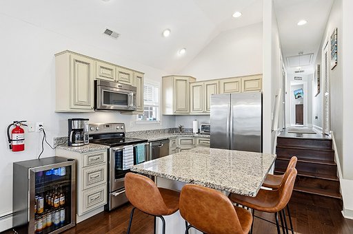 You’ll enjoy being close to all the action while tucked away in a peaceful, quiet neighborhood—truly the best of both worlds. Outdoor living is a dream here: soak in the views from the rooftop deck with six Adirondack chairs, enjoy your morning coffee on the front porch with two rocking swivel chairs and a four-top high-top table, or unwind on the back deck shared by the main and second bedrooms, drenched in morning sunlight.