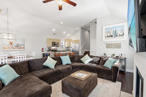 Step inside and be greeted by an inviting open-concept living space with vaulted ceilings and a bright, airy feel. The living room features a large sectional couch with plenty of seating, a cozy gas fireplace, and a massive 75-inch smart TV—perfect for movie nights or watching the game after a day in the sun.