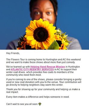 "If you're coming to one of the shows, please consider bringing a gently used or new coat donation with you to the venue," he wrote. "Your contribution will go directly to helping neighbors stay warm this winter."