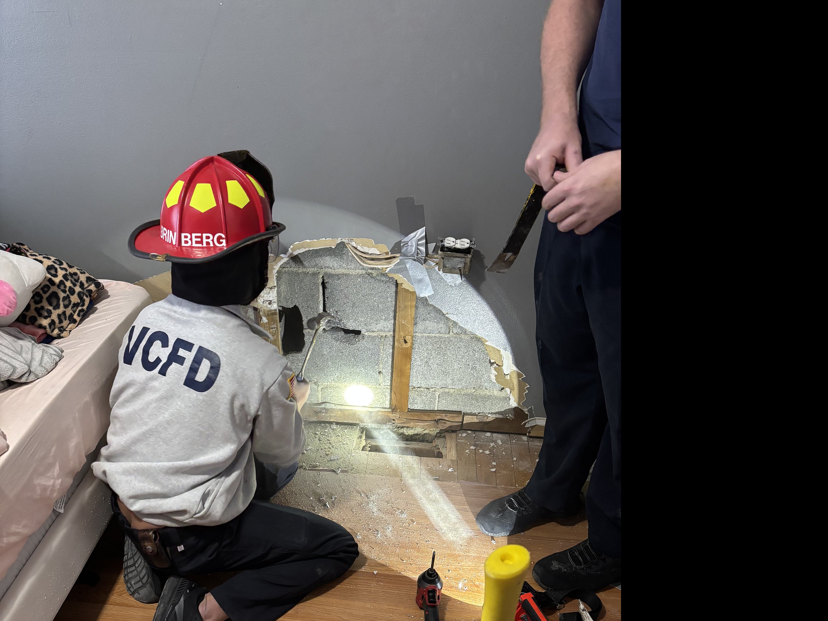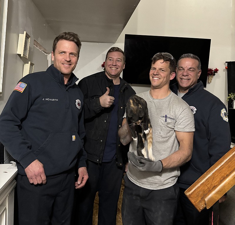 At 9:30 a.m. Friday morning, the homeowners called the fire department again to say that Buttercup was still trapped in the wall. This time, Engine 11 arrived with Lt. Jeff Brinberg and Firefighter Shaun Magill, along with Iannuzzelli and Building Department employee Pam Learn. Fire Chief Michael Cahill also was on scene to assist.
