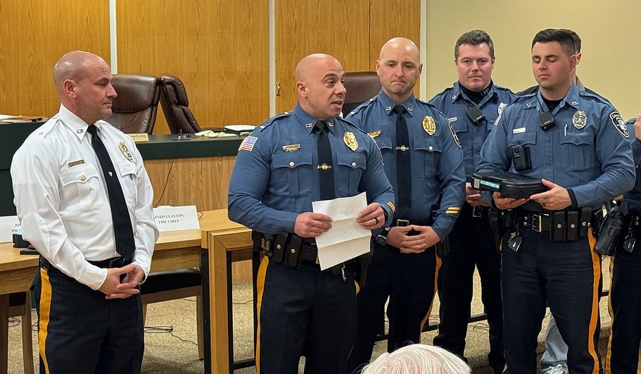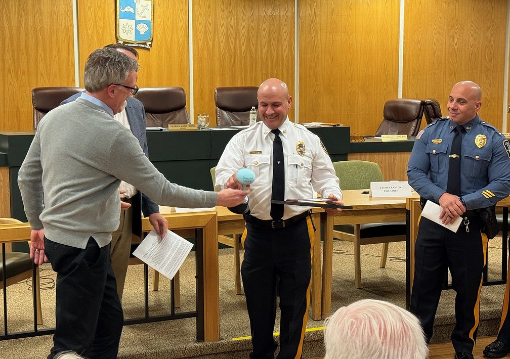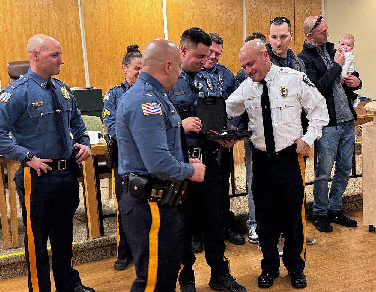 Representing the members of the Police Department, Lt. Ray Burgan presented him with his service weapon, a Glock 30 that he carried for more than 10 years, which was engraved with his name and service record. Burgan called it a symbol of his career in law enforcement.