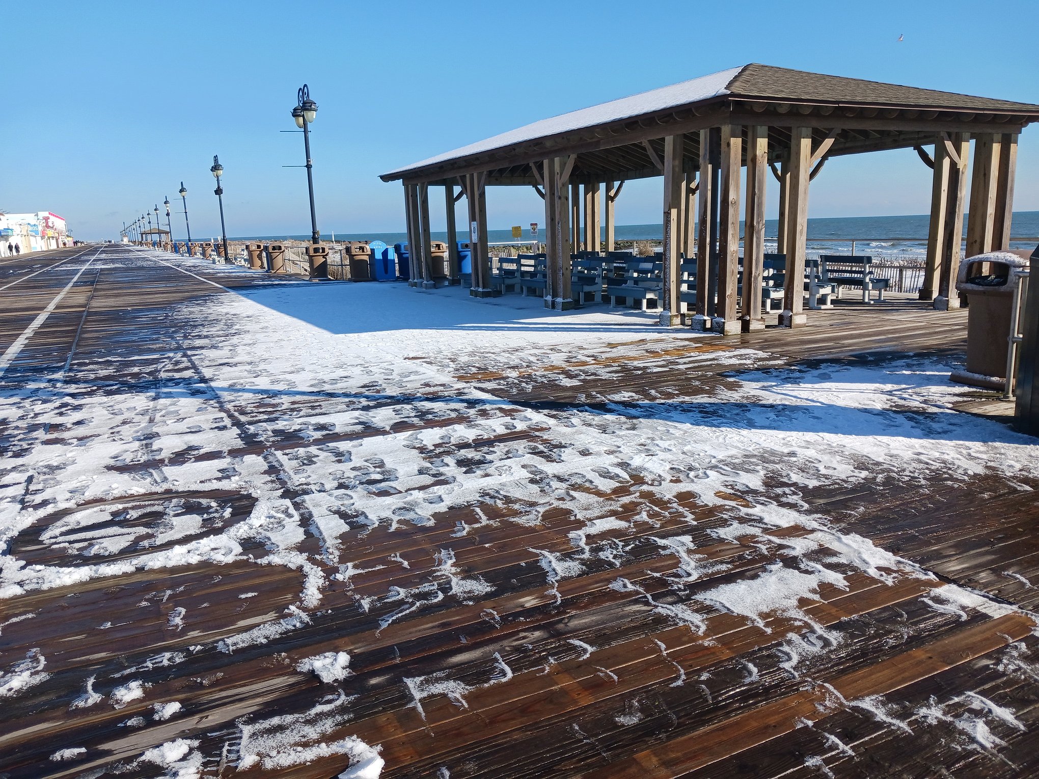 A light dusting of snow coats part of the Ocean City Boardwalk. Much more snow is on the way for this weekend.Storm preparations should include charging electronic devices; fueling/charging vehicles; having necessary medications and supplies for infants and pets; checking on the elderly and infirm; checking and replenishing storm supplies including non-perishable food items and water, flashlights and extra batteries, and a battery-operated radio; leaving indoor faucet dripping to avoid frozen pipes; and reviewing instructions to safely operate a portable generator outdoors.