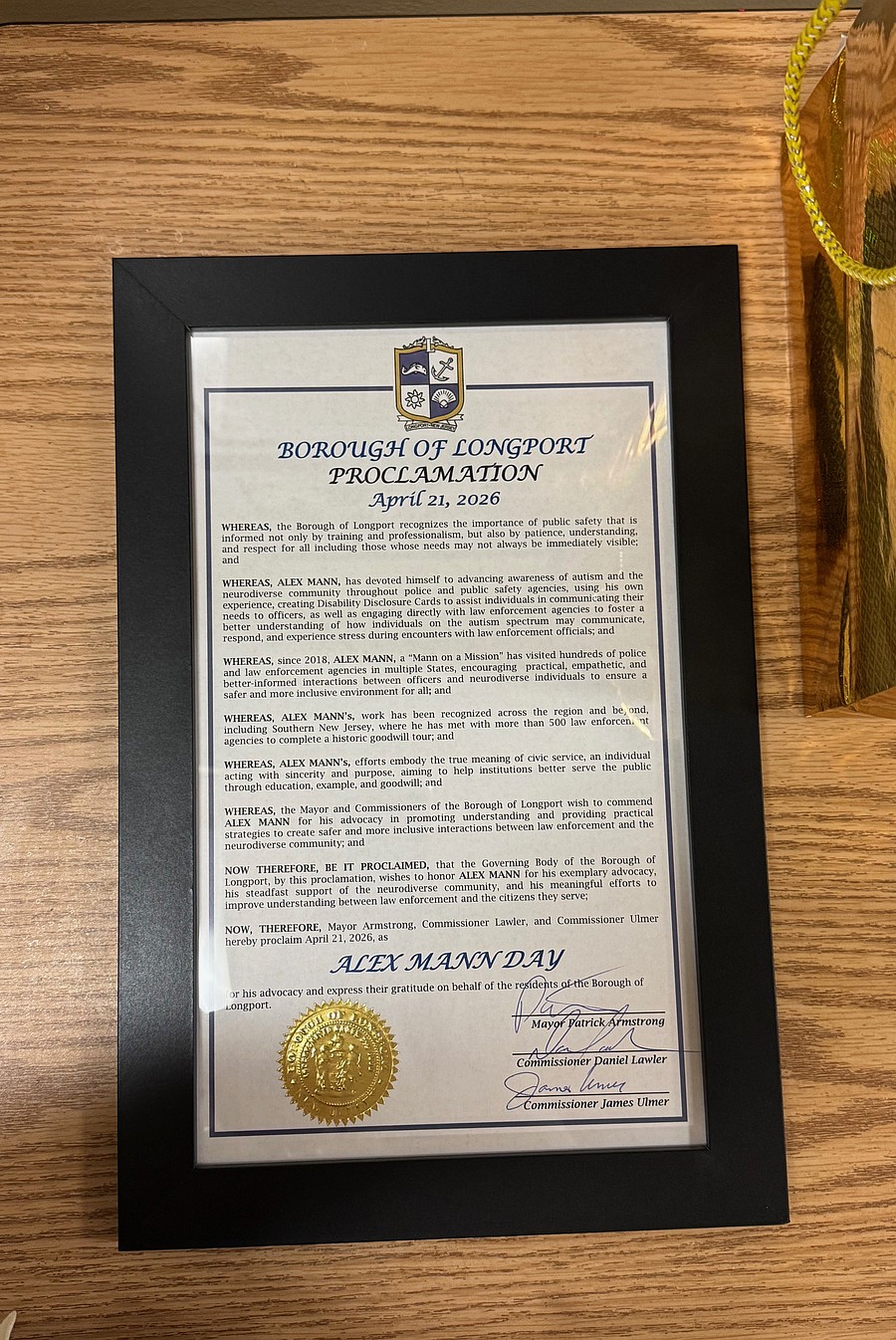 Autism awareness advocate Alex Mann visited the Longport Police Department Tuesday, April 21, 2026.